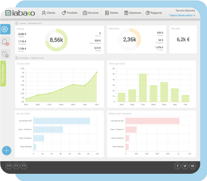 Tous les rapports à portée de main (chiffre d’affaires, TVA collectée/payée, impayés…).